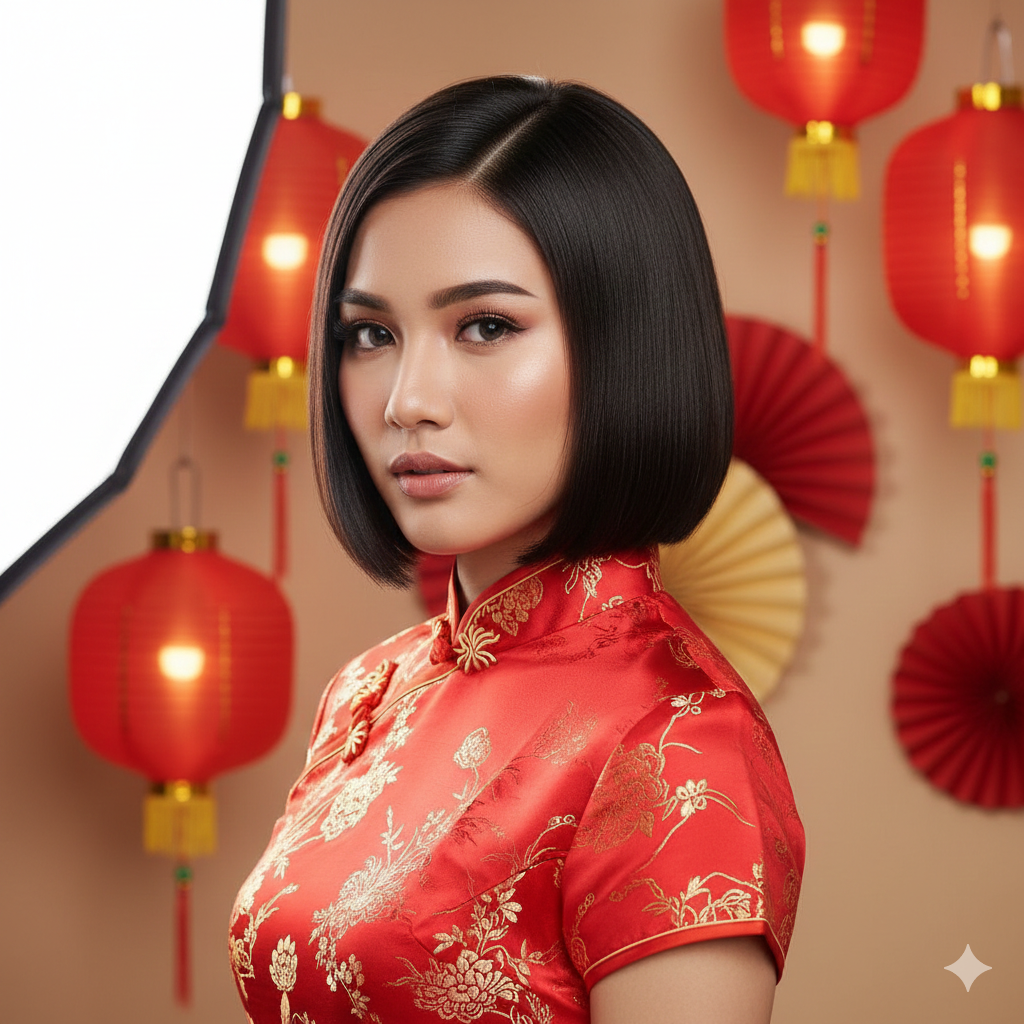The Modern Cheongsam Bob is a sleek, modern bob haircut with clean lines and a polished finish. Usually cut around the chin or slightly below, this style highlights the jawline and enhances facial structure.